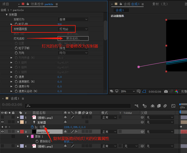 2-02 添加particular效果,创建点光,并且修改点光的名字为发射器,然后复制纯色层蒙版1上的路径,拷贝给点光的位置属性,修改发射器参数,类型为灯光